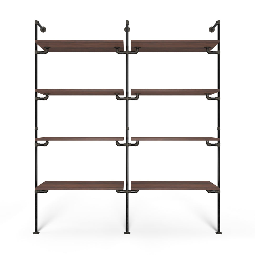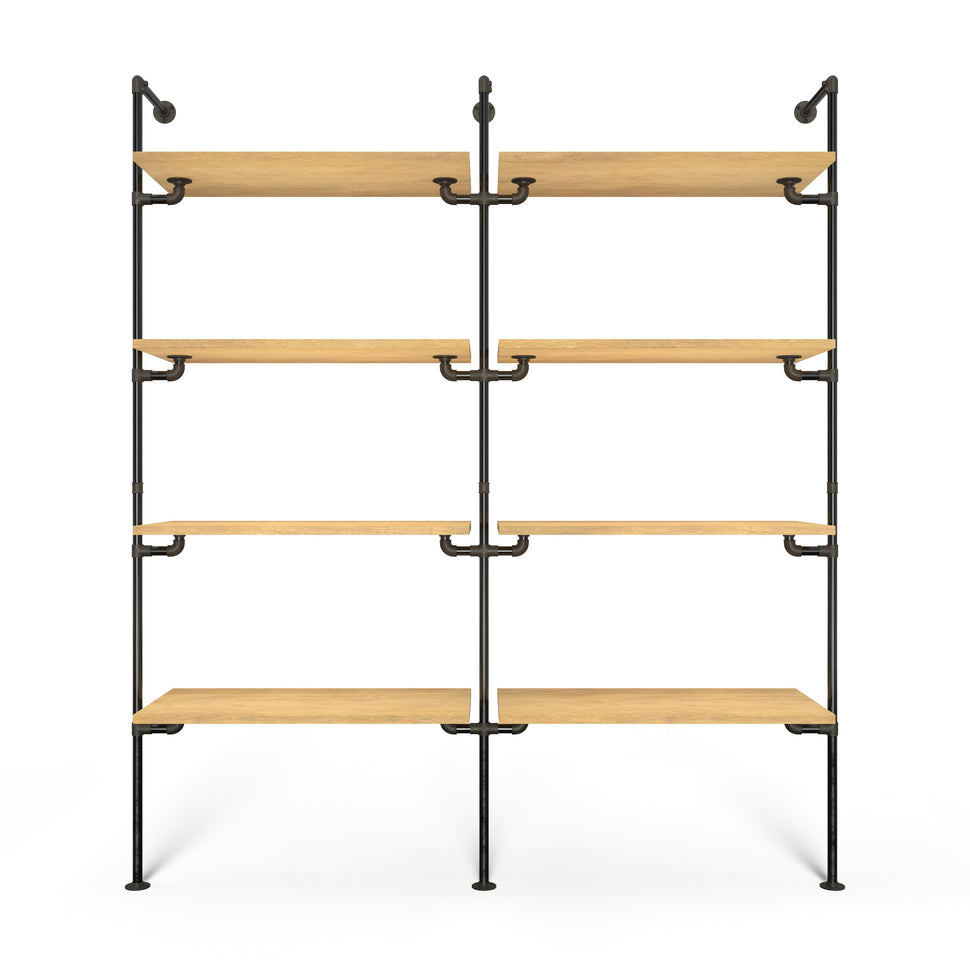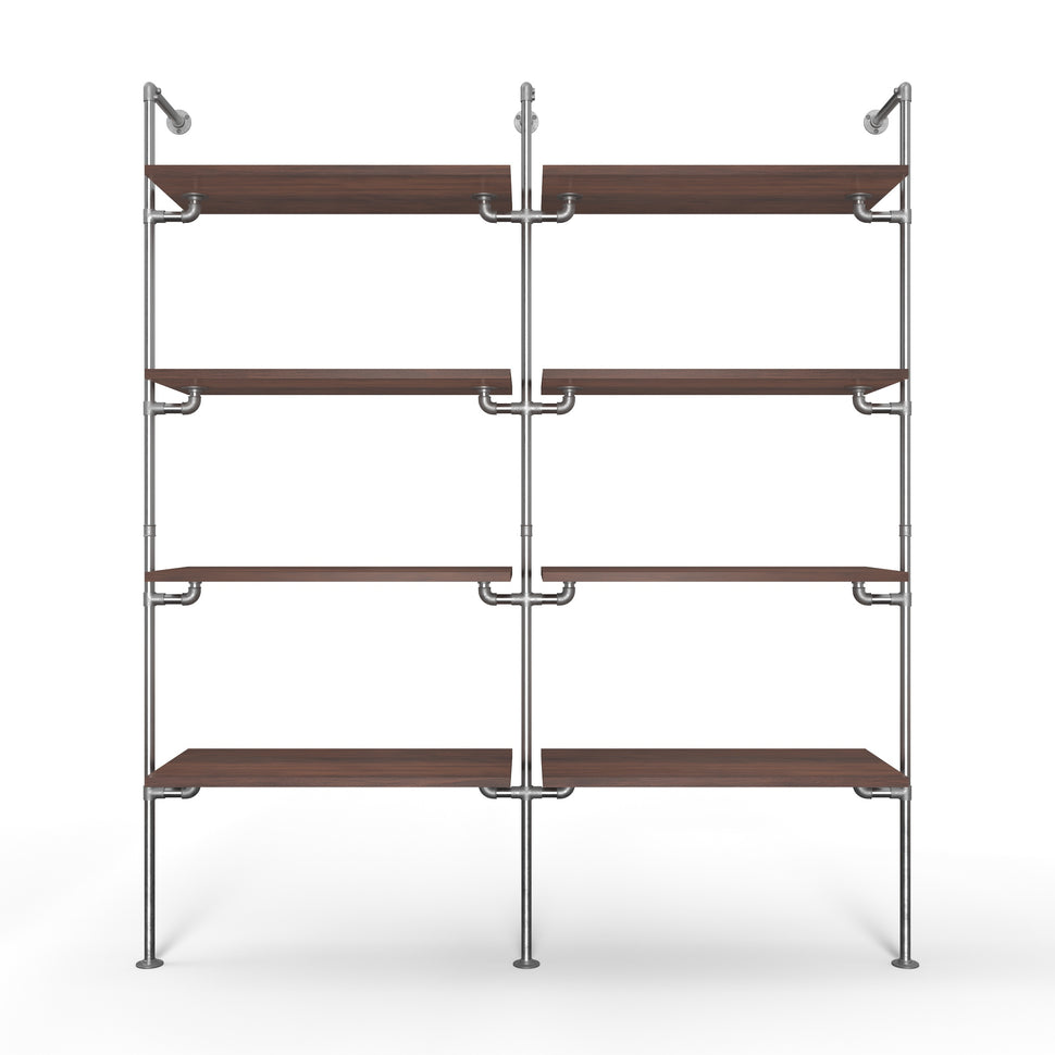 Unser System basiert auf langlebigen und robusten Materialien, die nicht nur für höchste Stabilität sorgen, sondern auch Ihr Zuhause stilvoll ergänzen. Durch die Verwendung von verstellbaren Holzbrettern und Wasserrohren in edlen Farben wie dunklem oder silbernem Look, erhalten Sie ein Erscheinungsbild, das sowohl modern als auch zeitlos ist. Das System bietet Ihnen: