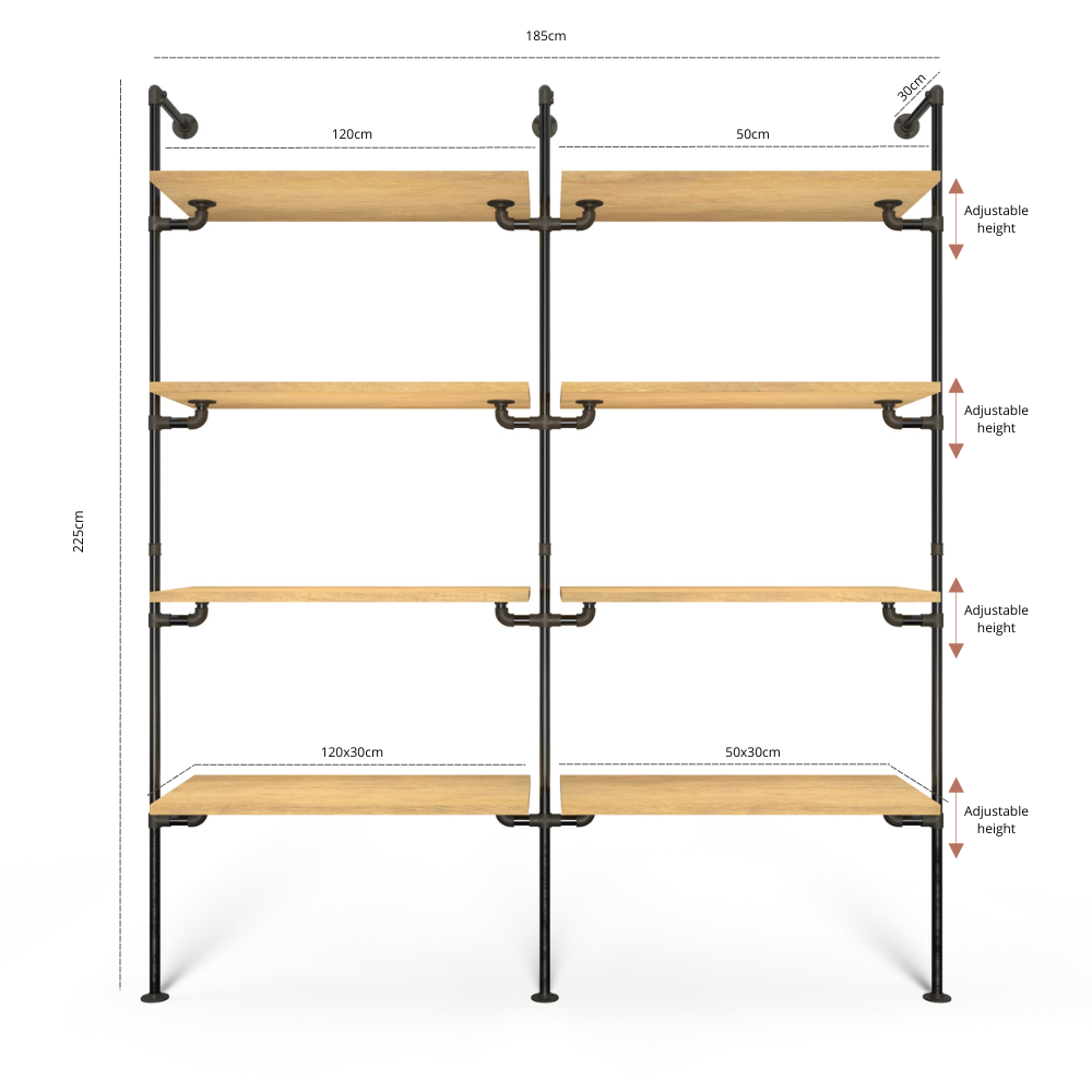 Unser System basiert auf langlebigen und robusten Materialien, die nicht nur für höchste Stabilität sorgen, sondern auch Ihr Zuhause stilvoll ergänzen. Durch die Verwendung von verstellbaren Holzbrettern und Wasserrohren in edlen Farben wie dunklem oder silbernem Look, erhalten Sie ein Erscheinungsbild, das sowohl modern als auch zeitlos ist. Das System bietet Ihnen: