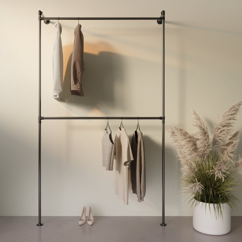 Unser Bob Steele Kleiderständer ist nicht nur ein optisches Highlight, sondern auch ein echtes Arbeitstier. Trotz seines kompakten Designs entfaltet er dank doppelt übereinander angeordneter Kleiderstangen maximalen Stauraum für Ihre Garderobe. Dank zweier extra stabiler Rohre wird der Ständer fest an der Wand montiert. Somit wird das Großteil des Gewichts von den clever platzierten Füßen getragen – ideal für Wände mit geringerer Traglast. Dabei müssen die Füße nicht dauerhaft im Boden verankert werden, was Ihnen zusätzliche Flexibilität bietet.