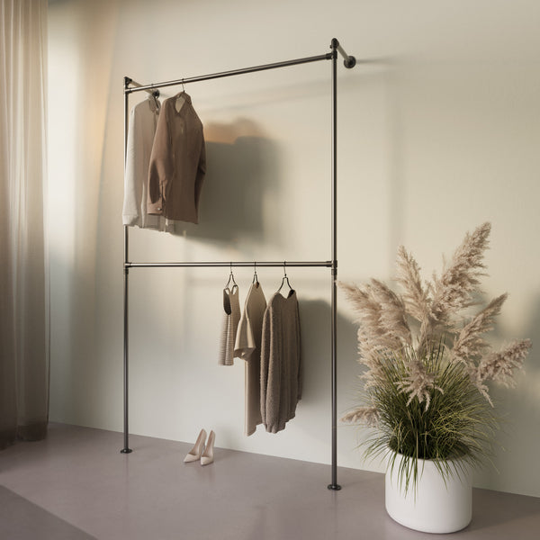 Mit unseren Kleiderständern aus Wasserrohren sind die Möglichkeiten unendlich. Egal, ob du eine einfache Kleiderstange zum Aufhängen deiner Kleidung, ein Regalsystem für Schuhe und Accessoires oder einen kompletten, begehbaren Kleiderschrank mit Platz für alle deine Kleidungsstücke benötigst. Zwischen unserer breiten Auswahl an Standardmodellen und der Möglichkeit für Sonderanfertigungen, finden wir auf jeden Fall die perfekte Lösung für dich.