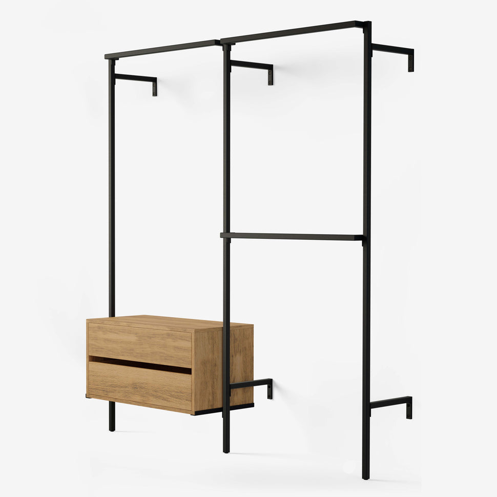 Haben Sie genug von unübersichtlichen und unfunktionalen Kleiderschränken? Mit dem Frame Walk-In 2 Reihen Kleiderstangensystem - (1 Kleiderstange + 1 Kommode / 2 Kleiderstangen) bieten wir Ihnen eine Lösung, die nicht nur durch ihre Ästhetik, sondern auch durch ihre Funktionalität überzeugt. Wir bei RackBuddy haben dieses System entwickelt, um Ihre Raumplanung zu optimieren und Ihre Garderobe optimal zu organisieren – ganz ohne Kompromisse bei Design und Nachhaltigkeit.