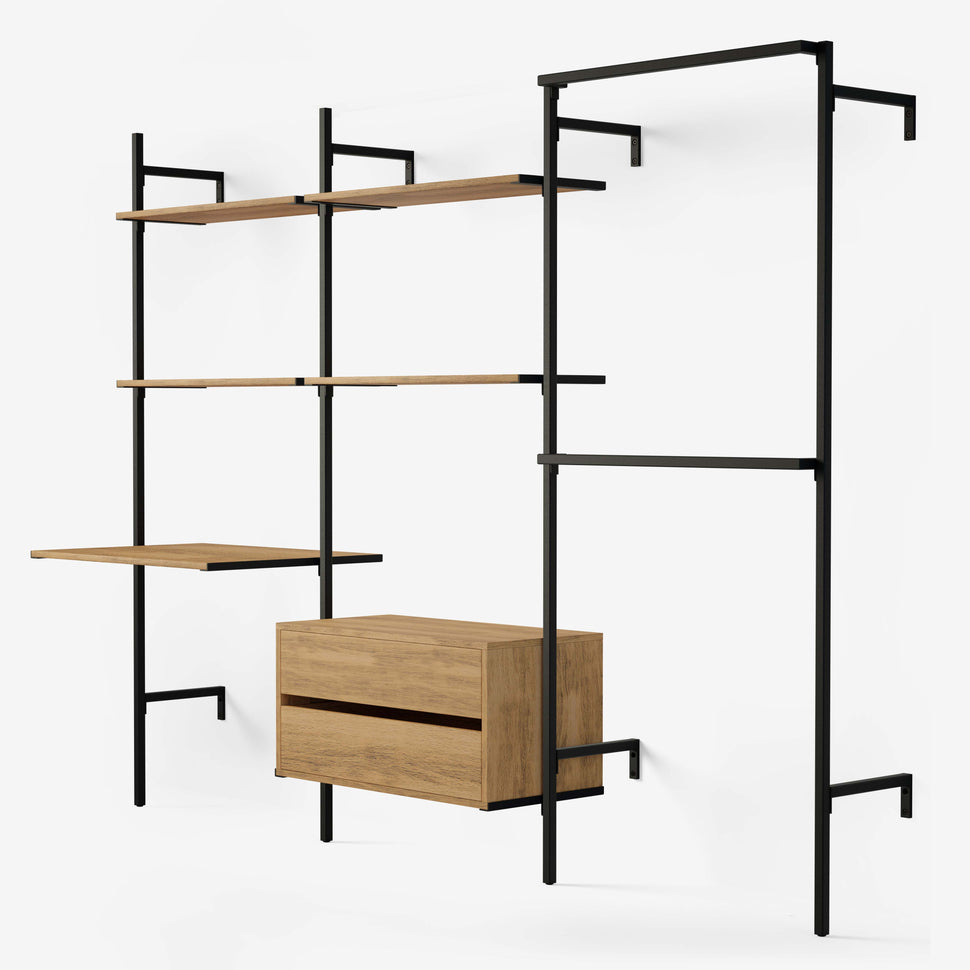 Vielseitige Konfiguration: Wählen Sie zwischen zwei Varianten – 2 Regale plus 1 Tisch oder 2 Regale plus 1 Kommode, ergänzt durch 2 Kleiderstangen.