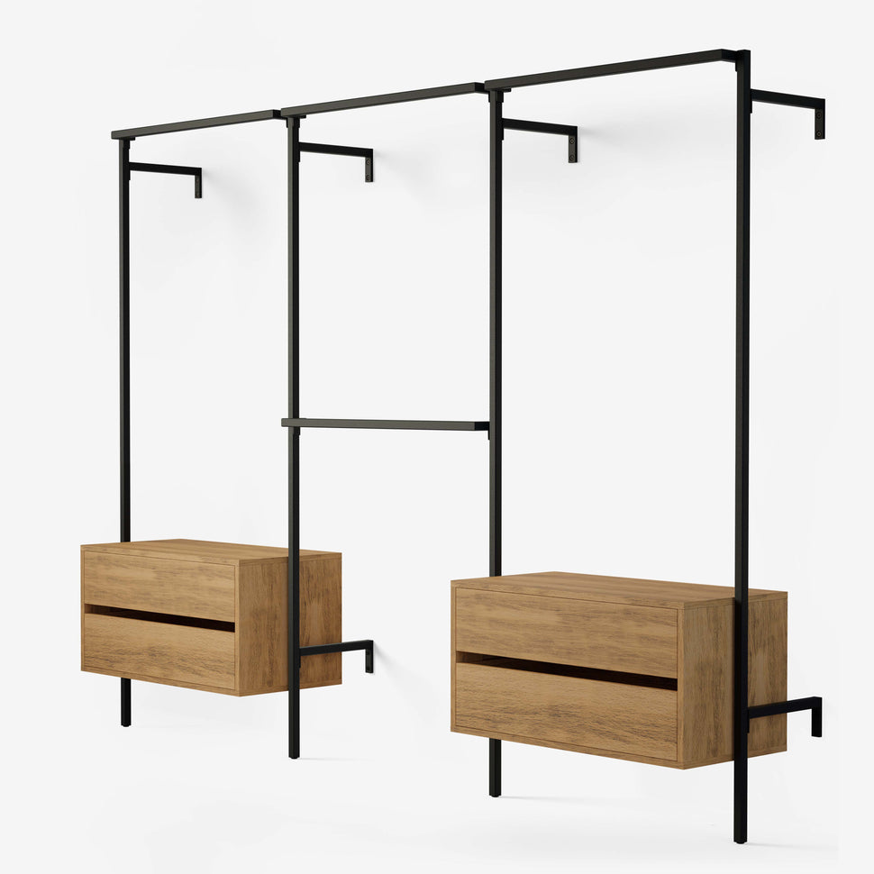 Haben Sie genug von unübersichtlichen Schranklösungen? Mit unserem Frame Walk-In 3 Reihen Kleiderstangensystem - (1 Kleiderstange + 1 Kommode / 2 Kleiderstangen / 1 Kleiderstange + 1 Kommode) bieten wir Ihnen die Antwort auf Ihre Herausforderungen in puncto Ordnung und Stil. Wir bei RackBuddy entwickeln langlebige und flexible Garderobenlösungen für anspruchsvolle Lebensräume.