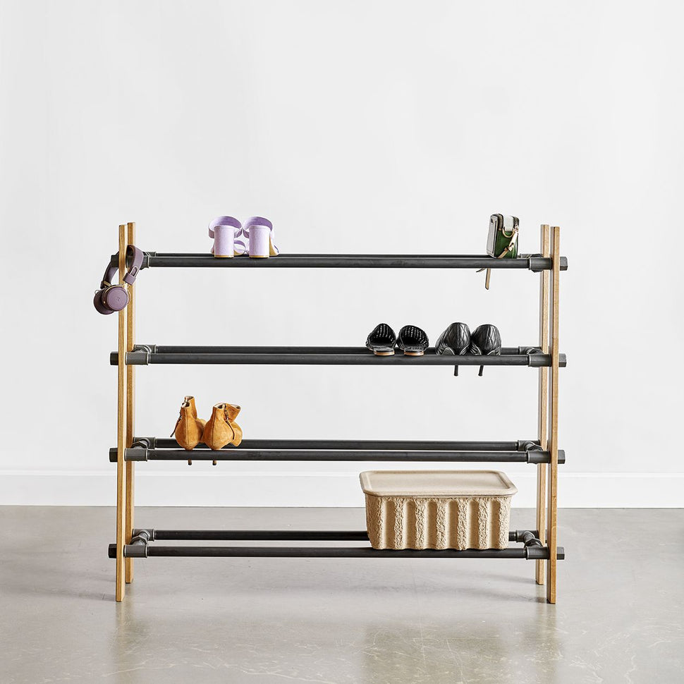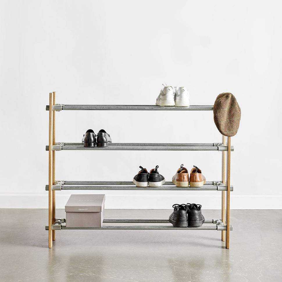 Unser Schuhregal überzeugt durch seinen Rahmen aus geölter, FSC-zertifizierter Eiche, der nicht nur nachhaltig, sondern auch äußerst langlebig ist. Die Kombination aus klassischem Holz und eleganten Wasserrohren sorgt für einen industriellen, aber zugleich warmen Look – die ideale Lösung für jeden, der Wert auf robustes Design und individuelle Anpassbarkeit legt.