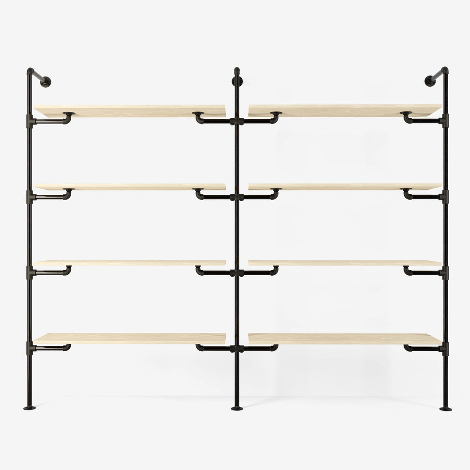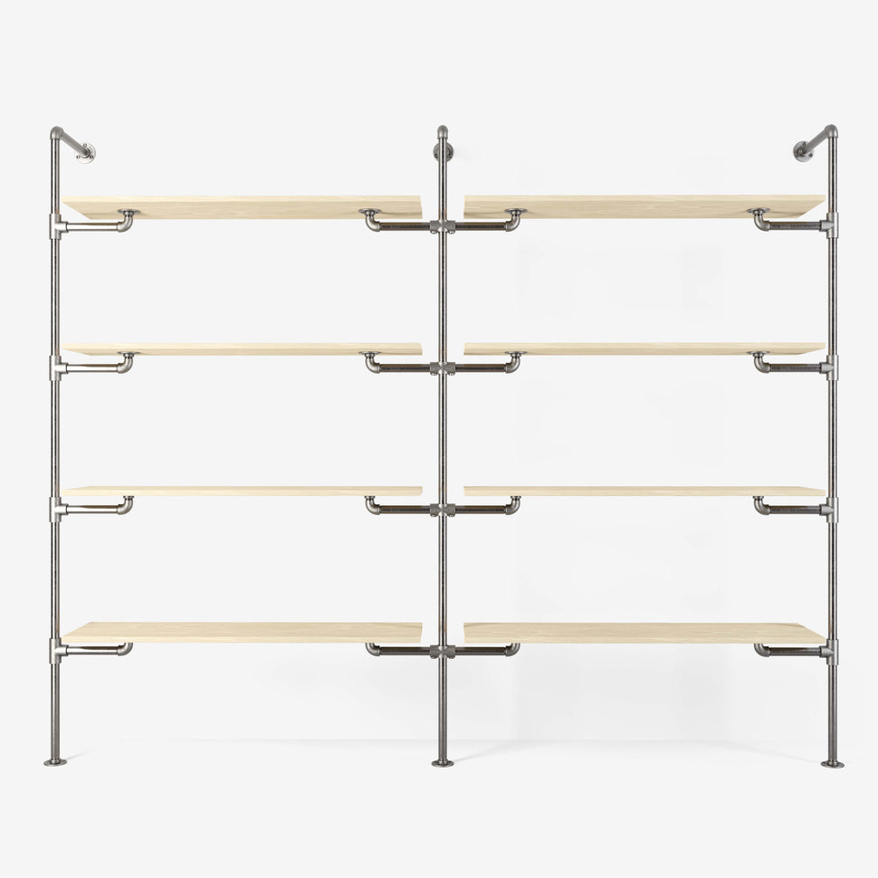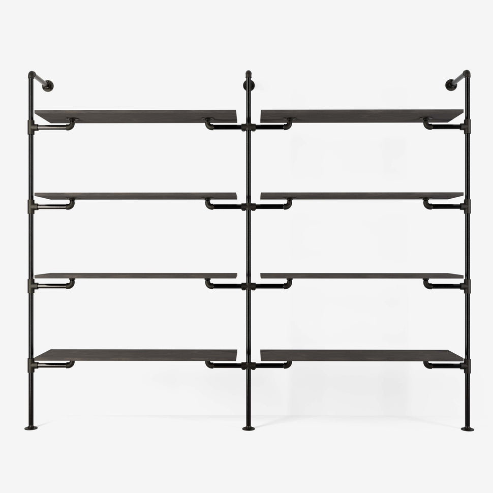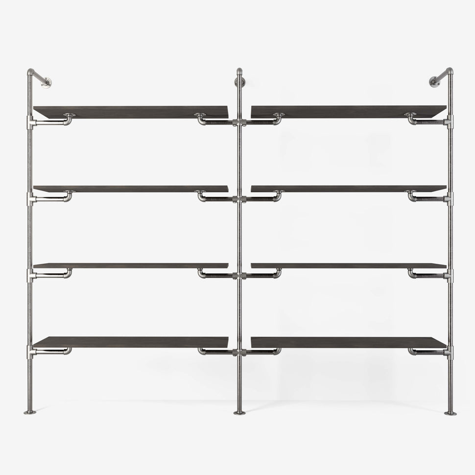 Unser System basiert auf langlebigen und robusten Materialien, die nicht nur für höchste Stabilität sorgen, sondern auch Ihr Zuhause stilvoll ergänzen. Durch die Verwendung von verstellbaren Holzbrettern und Wasserrohren in edlen Farben wie dunklem oder silbernem Look, erhalten Sie ein Erscheinungsbild, das sowohl modern als auch zeitlos ist. Das System bietet Ihnen: