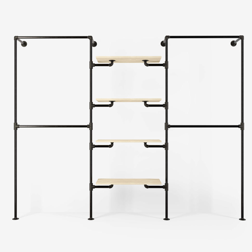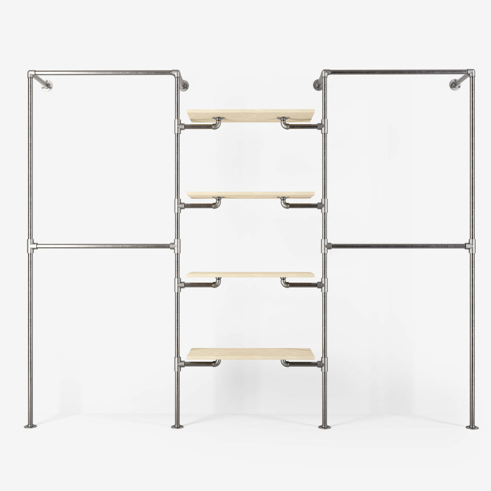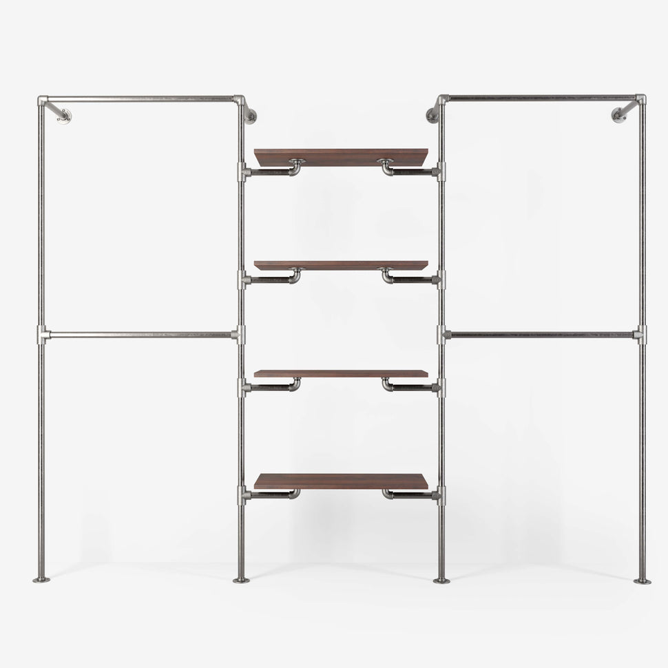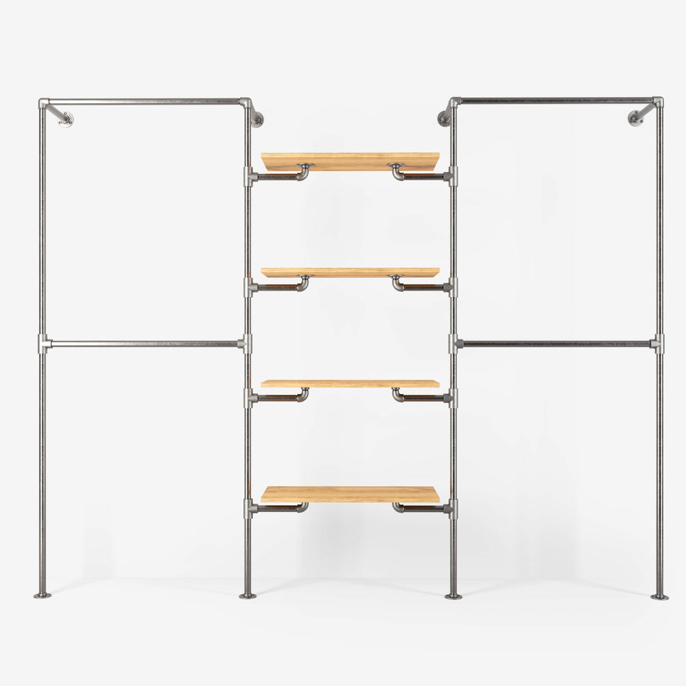 Dieses Design der The Walk-In Collection ermöglicht es dir, deine Kleidung auf zwei Ebenen in den äußere Abteilen aufzuhängen. Verwende die in der Höhe verstellbaren Holzregale in der Mitte für Schuhe, Taschen, Boxen oder Sonstiges, das in deinem offenen Kleiderschrank nicht fehlen darf. Du kannst die Regale dazu verwenden, deine Lieblingsschuhe zu präsentieren oder persönliche Gegenstände wie Bilder, Bücher und Pflanzen zu verstauen.
