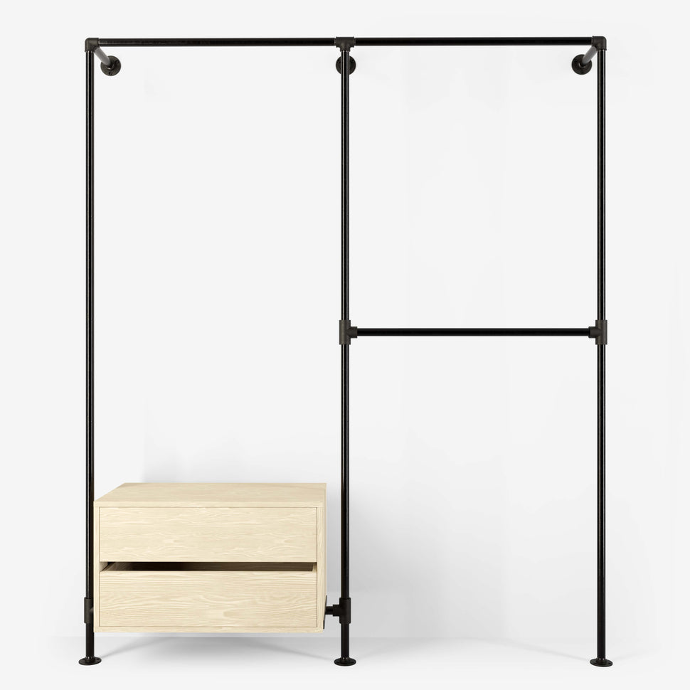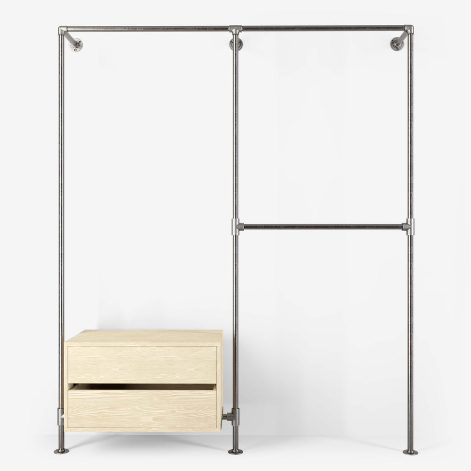 Mit The Walk-In mit Kommode - (1 Stange + 1 Kommode / 2 Stangen) erhalten Sie eine Komplettlösung für einen ordentlichen, begehbaren Kleiderschrank: