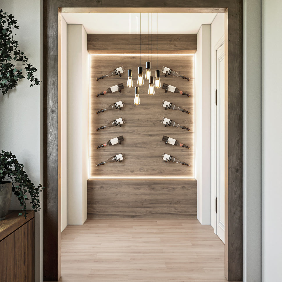 Design: Zweiteiliges, wandmontiertes System, das jede Weinflasche in einem idealen Winkel positioniert.