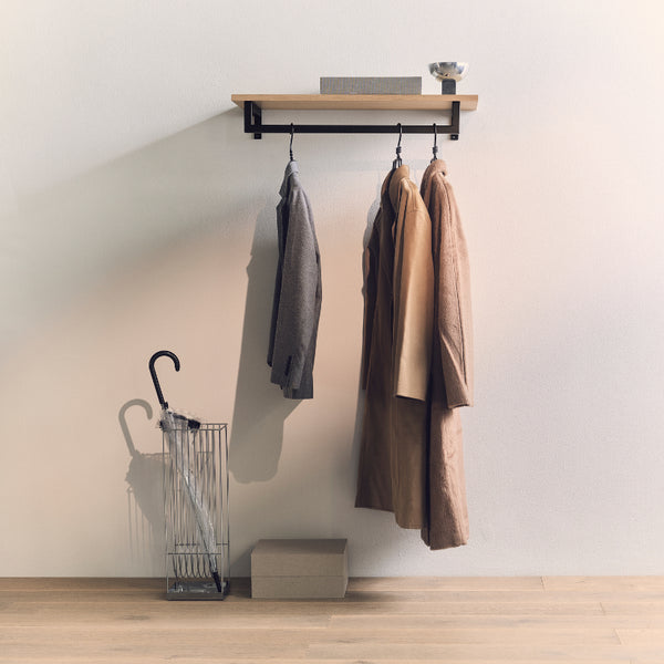 Ganz besonders praktisch für alle mit wenig Platz ist unser Frame Marlow: Eine Kleiderstange in Kombination mit einem Regalbrett darüber. Auch hier kannst du wieder zwischen den Eichenholzregalen im geräucherten oder klassischen Farbton wählen. So kannst mit einem Produkte du deine komplette Garderobe und Accessoires unterbringen.