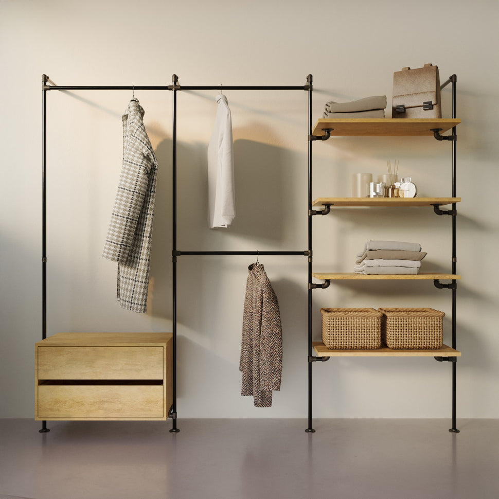 Mit The Walk-In mit Kommode - (1 Stange + 1 Kommode / 2 Stangen / 4 Regale) von RackBuddy transformieren Sie jede Garderobe in einen Raum, der alle Ihre Wünsche erfüllt. Die Kombination aus eleganten Wasserrohren und warmen Holzoberflächen sorgt für ein minimalistisches, skandinavisches Design, das perfekt zu modernen Wohnkonzepten passt.