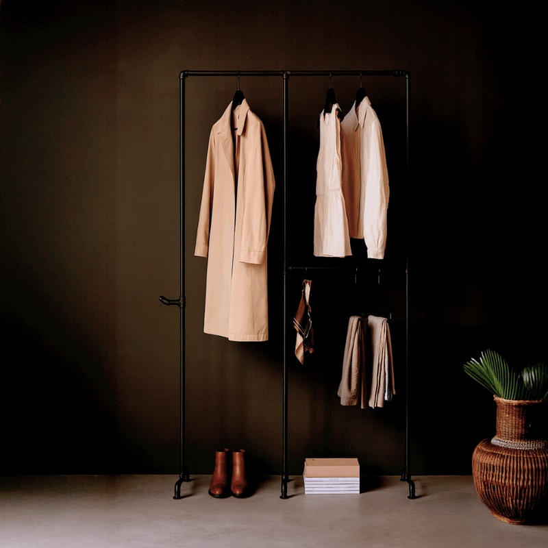 Ob kleines Apartment, kreatives Studio oder offene Garderobe – Wild Bill Elliot zieht die Blicke auf sich. Die mattschwarzen Eisenrohre schaffen eine urbane Ästhetik und rücken deine Kleidung stilvoll ins Zentrum.