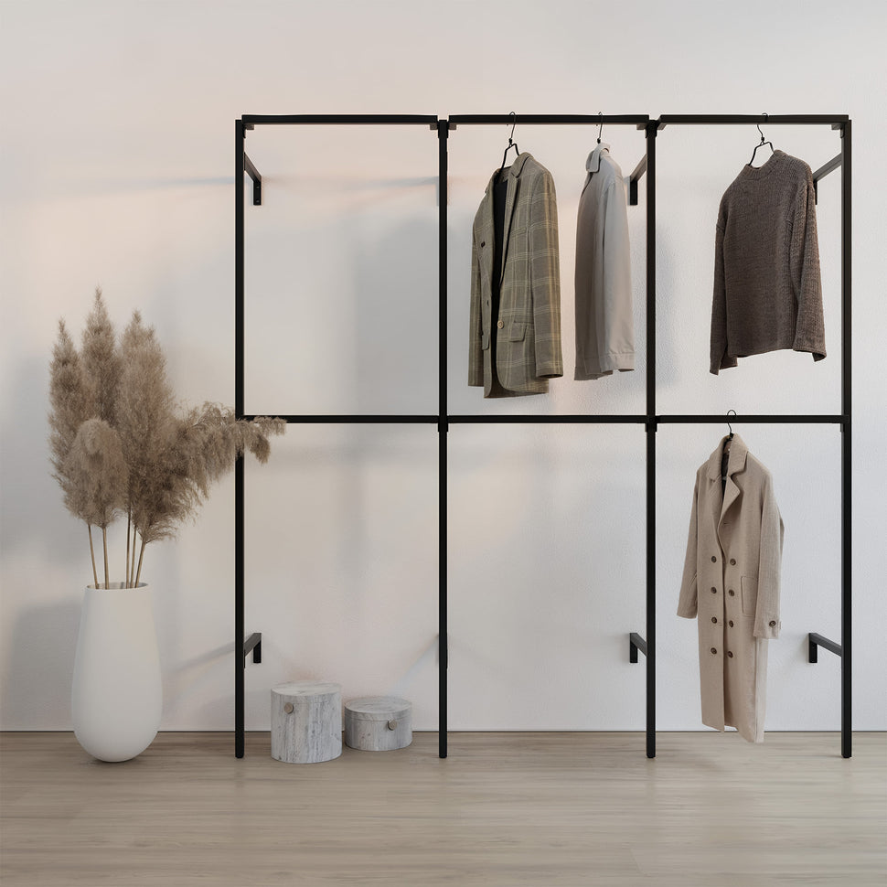 Haben Sie auch das Gefühl, dass Ihre Garderobe nicht genug Platz für Ihre stilvollen Outfits bietet? Wir von RackBuddy wissen, wie wichtig es ist, Ordnung und Ästhetik perfekt miteinander zu verbinden. Unser "Frame Walk-In 3 Reihen Kleiderstangensystem - (2 Kleiderstangen / 2 Kleiderstangen / 2 Kleiderstangen)" ist die ideale Lösung für Sie – und ein echtes Statement für jedes moderne Zuhause. Mit diesem innovativen Kleiderstangensystem verwandeln wir Ihre Garderobe in einen Raum, der Ihre Ansprüche an Design, Funktionalität und Nachhaltigkeit erfüllt.
