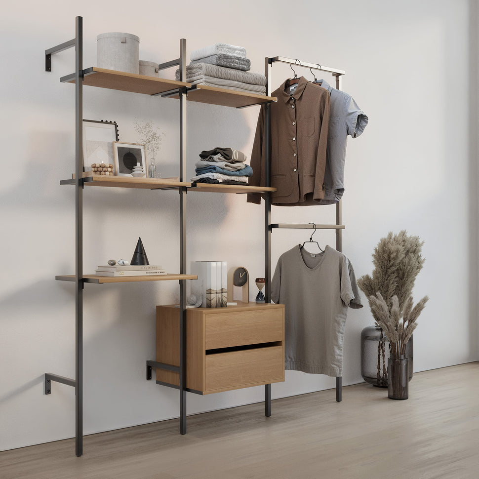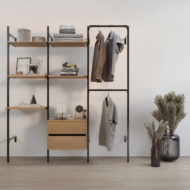 Vielseitige Konfiguration: Wählen Sie zwischen zwei Varianten – 2 Regale plus 1 Tisch oder 2 Regale plus 1 Kommode, ergänzt durch 2 Kleiderstangen.