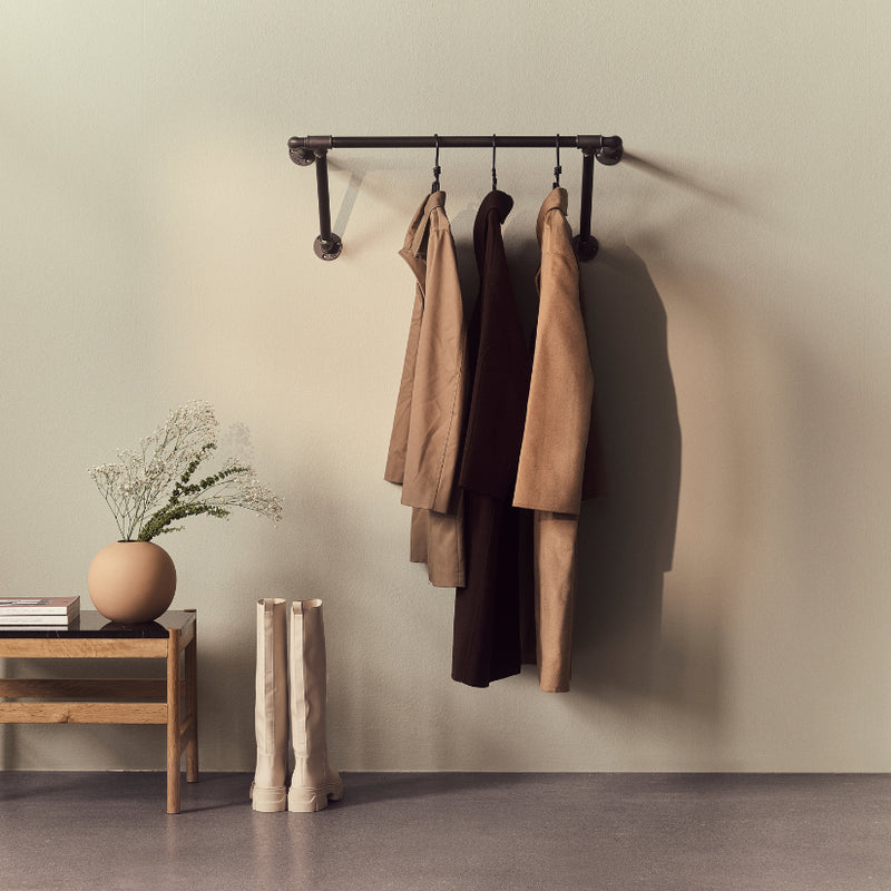 Unsere Wyatt Kleiderstange wurde aus robusten Wasserrohren gefertigt und überzeugt durch ihr zeitloses Design in Silber oder Dunkel. Sie integriert sich nahtlos in moderne Innenräume – sei es im Flur, Schlafzimmer oder sogar in der Küche. Die Kleiderstange bietet endlose Möglichkeiten, Ihre Garderobe individuell zu organisieren, ohne dabei zusätzlichen Raum zu beanspruchen.