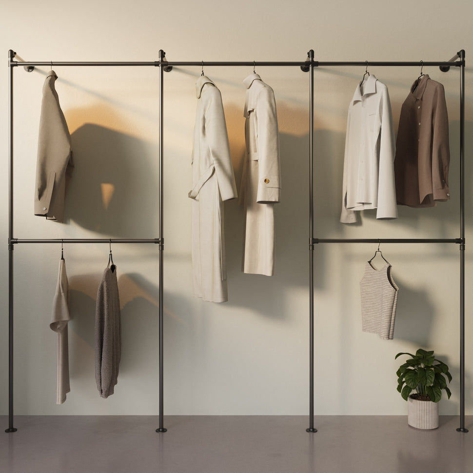 Mit unserem Kleiderstangensystem setzen Sie auf durchdachtes Design und langlebige Qualität. Es vereint Funktionalität und Ästhetik, sodass Sie immer Ihr perfektes Lauf-in Closet erhalten: