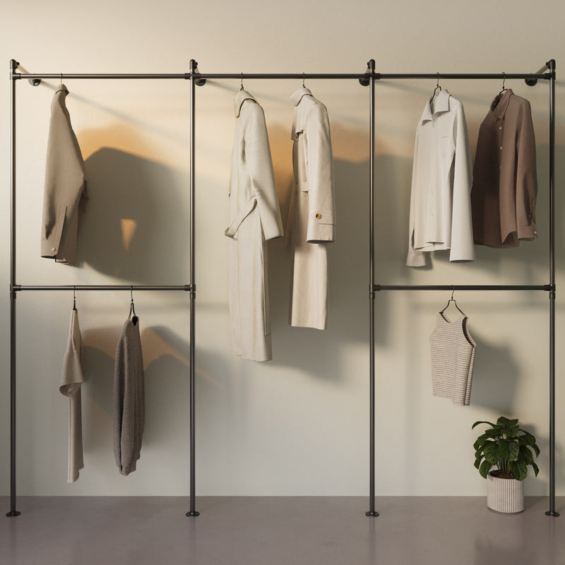 Erleben Sie mit unserem "The Walk-In 3 Reihen Kleiderstangensystem - (2 Stangen / 1 Stange / 2 Stangen)" eine Lösung, die perfekt auf Ihre Bedürfnisse zugeschnitten ist. Wir von RackBuddy wissen, wie wichtig eine optimale und stilvolle Garderobenorganisation ist – insbesondere in urbanen und begrenzten Räumen. Unsere innovative, anpassbare Lösung bietet Ihnen nicht nur maximalen Stauraum, sondern auch ein elegantes Design, das sich nahtlos in Ihr Zuhause einfügt.