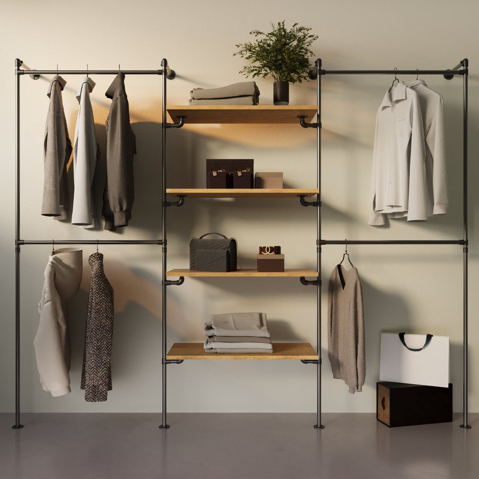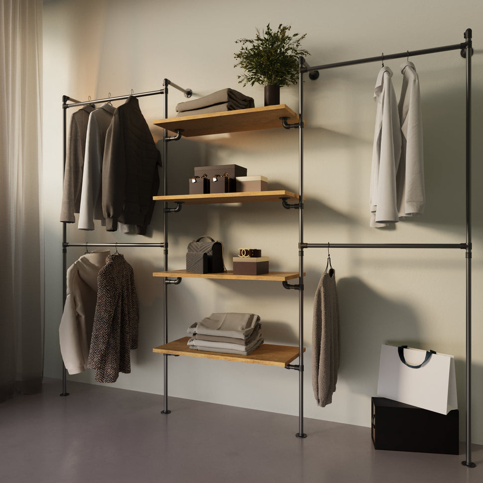 Dieses Design der The Walk-In Collection ermöglicht es dir, deine Kleidung auf zwei Ebenen in den äußere Abteilen aufzuhängen. Verwende die in der Höhe verstellbaren Holzregale in der Mitte für Schuhe, Taschen, Boxen oder Sonstiges, das in deinem offenen Kleiderschrank nicht fehlen darf. Du kannst die Regale dazu verwenden, deine Lieblingsschuhe zu präsentieren oder persönliche Gegenstände wie Bilder, Bücher und Pflanzen zu verstauen.